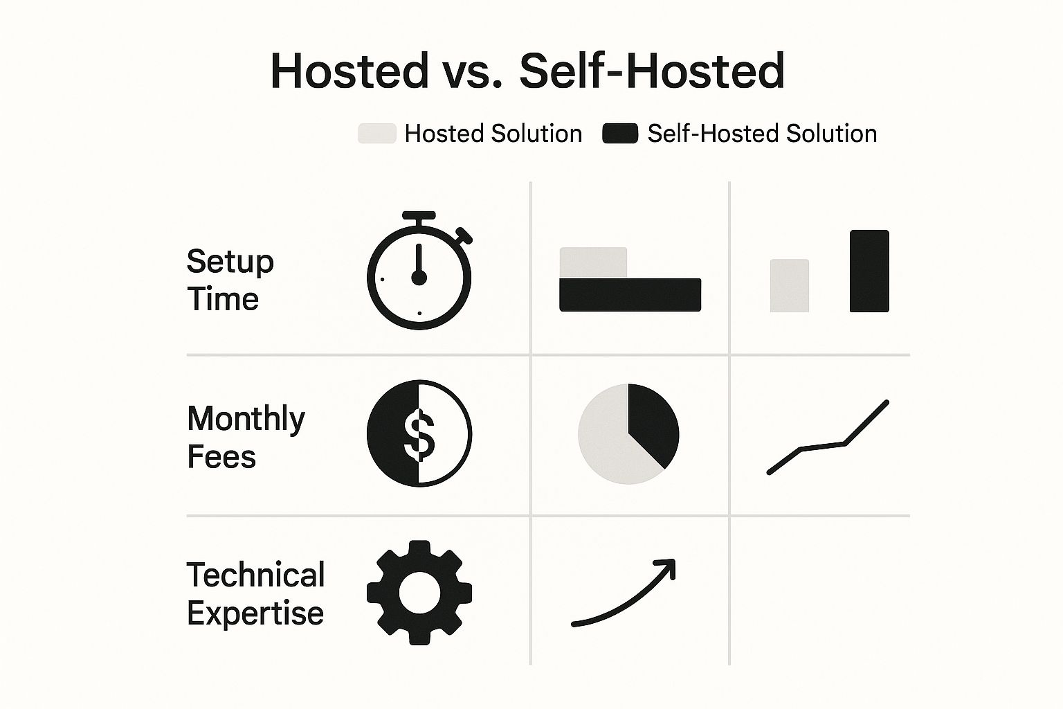 As you can see, there's a clear trade-off. Hosted solutions get you up and running fast, but the convenience can come with higher fees. Self-hosted options require more work upfront but can lead to lower costs in the long run.
